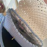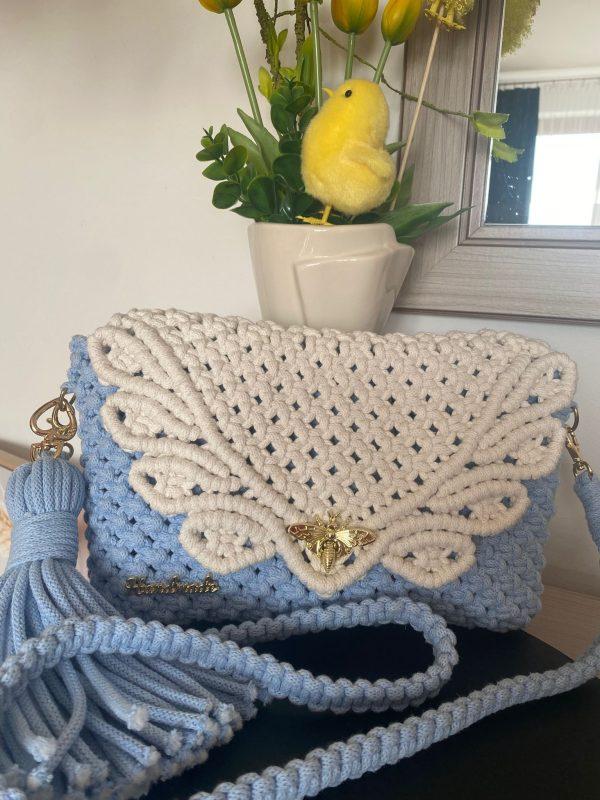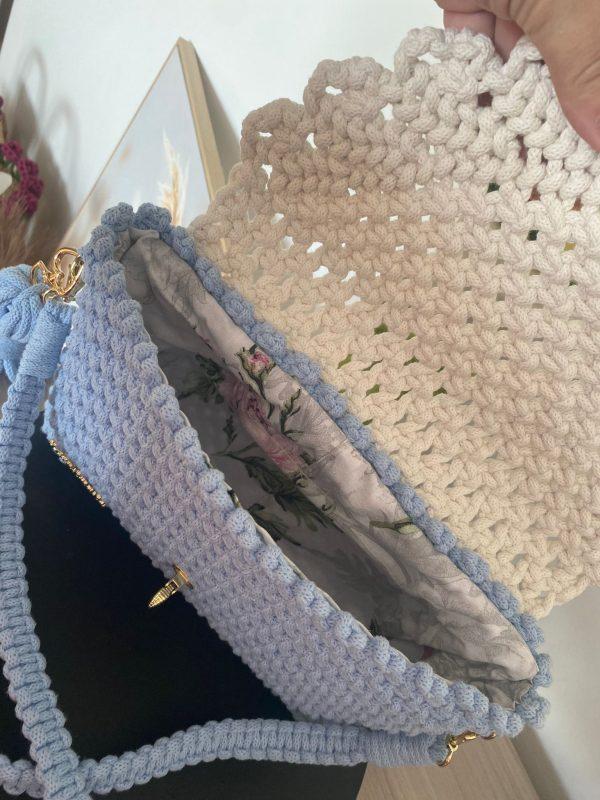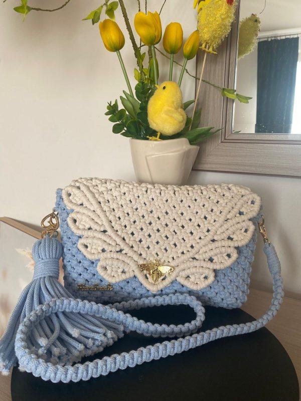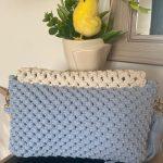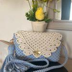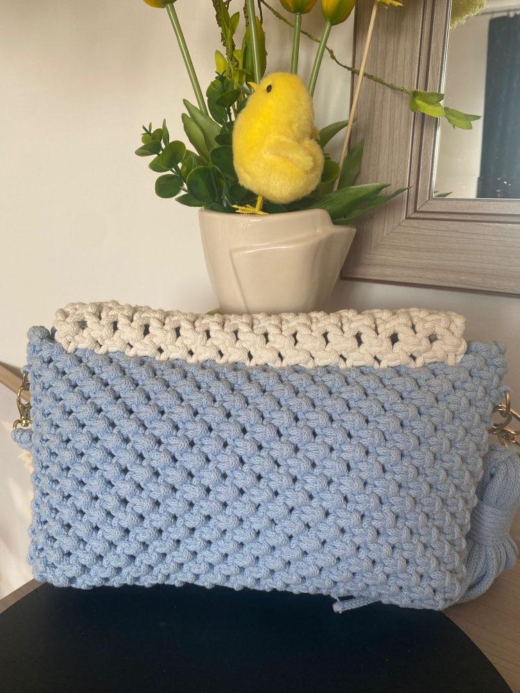 Diese handgefertigte Tasche aus hochwertigem 5-mm-Baumwollgarn besticht durch ihr zartes hellblaues Design und die kontrastierende Klappe in Ecru.