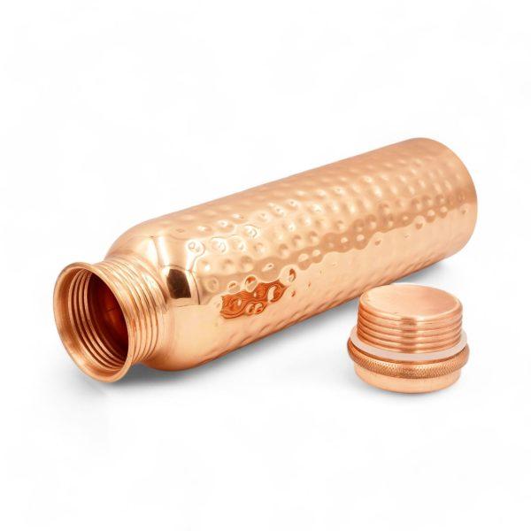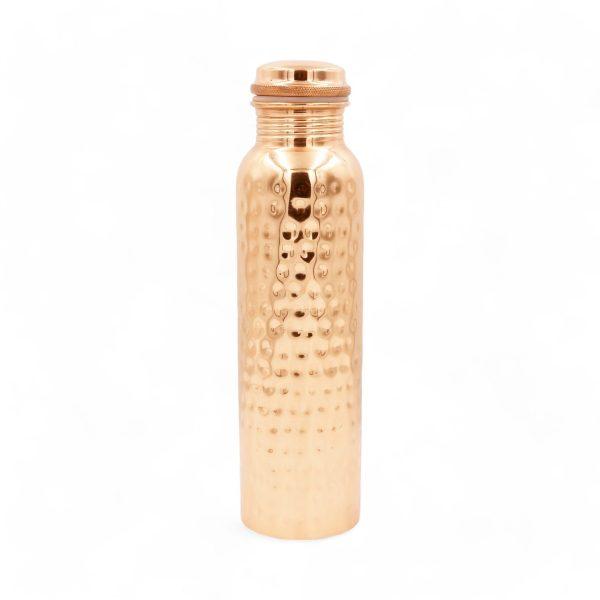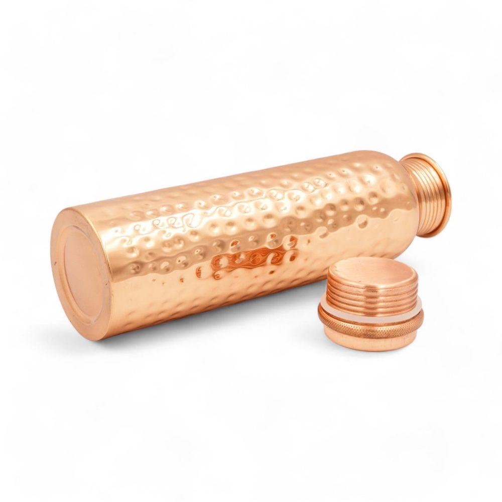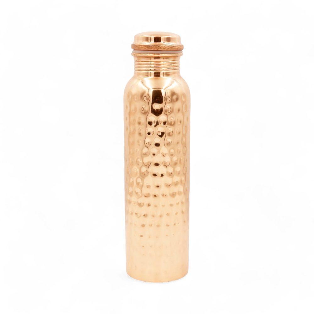 Kurzbeschreibung: Handgefertigte Kupferflasche mit klassischer gehämmerter Oberfläche. Nutzt die natürlichen, hygienischen Eigenschaften des Kupfers – für vitalisierendes Trinkwasser nach ayurvedischer Tradition.