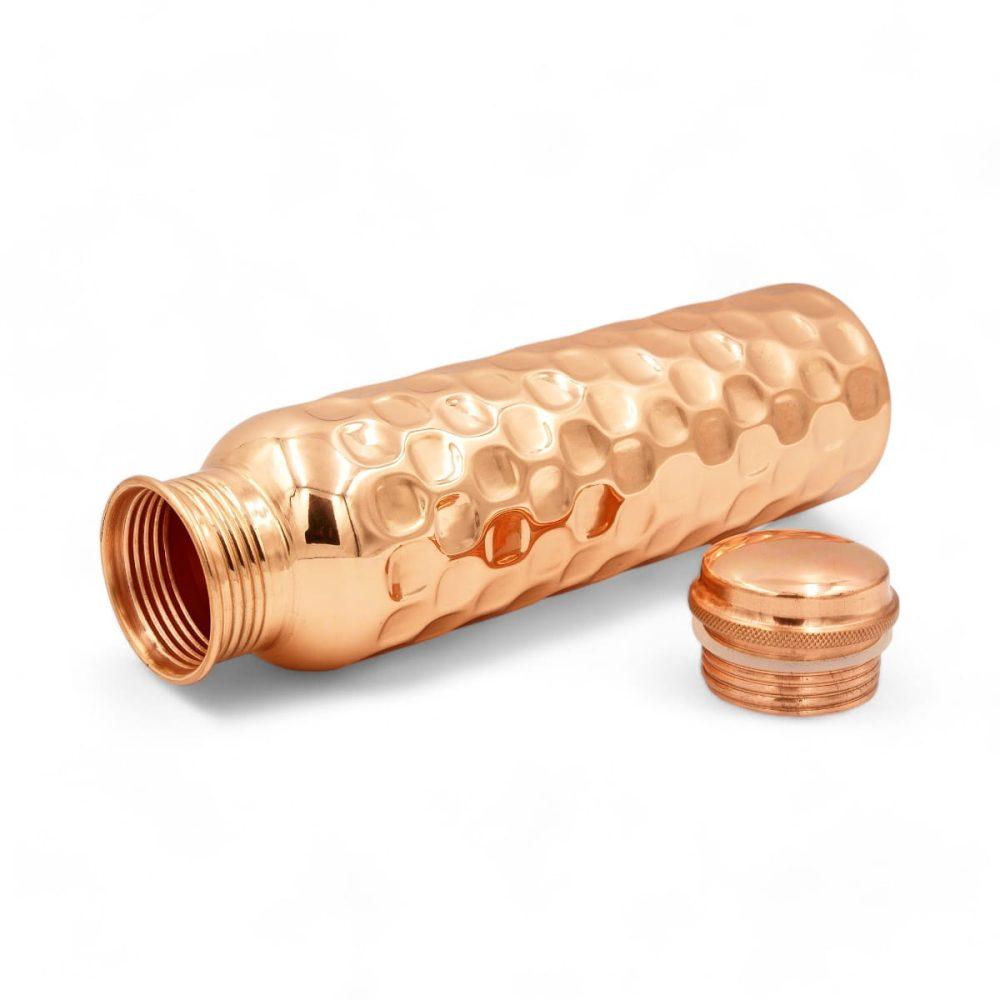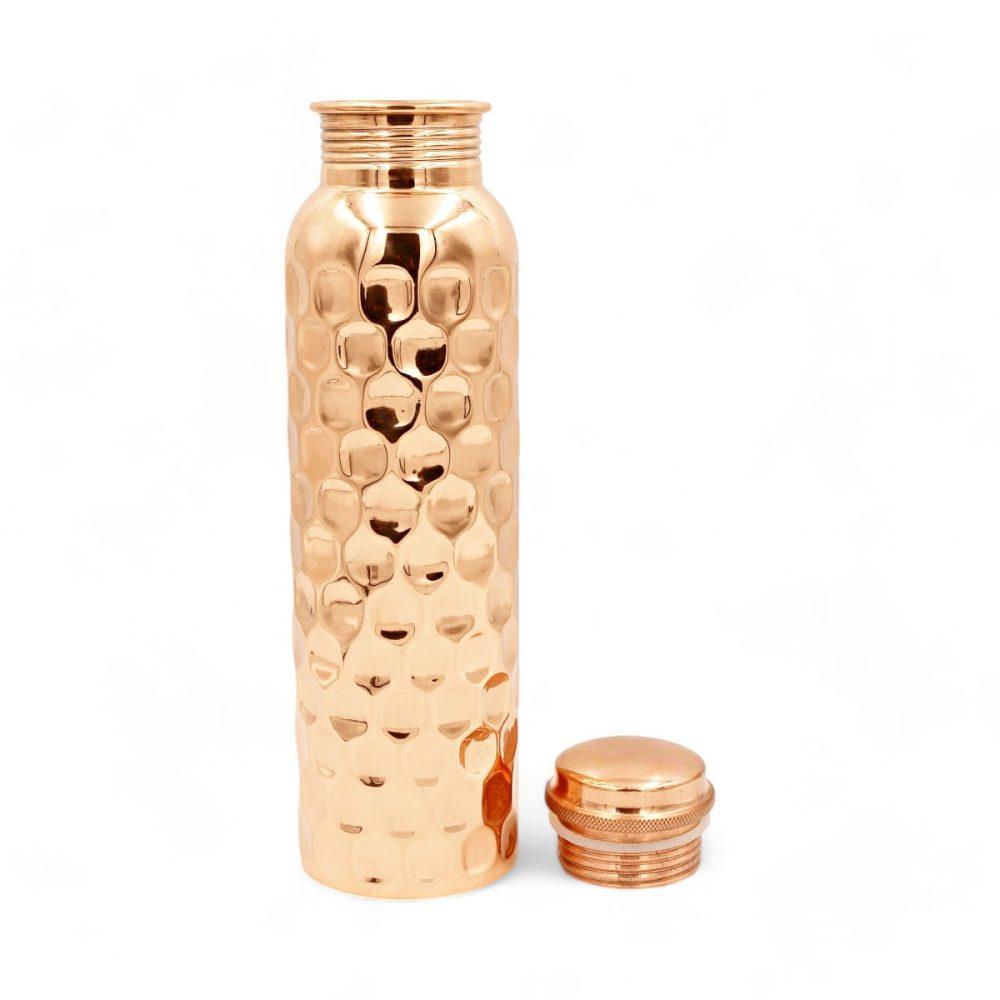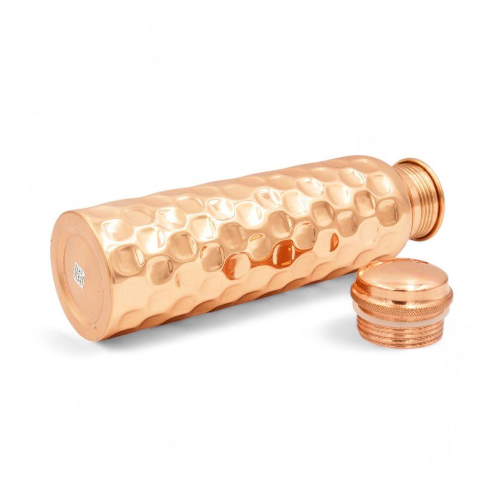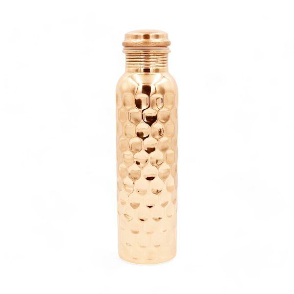Kurzbeschreibung: Handgefertigte Kupferflasche mit modernem Wabenmuster-Design (Honeycomb). Nutzt die natürlichen, hygienischen Eigenschaften des Kupfers – für vitalisierendes Trinkwasser nach ayurvedischer Tradition.