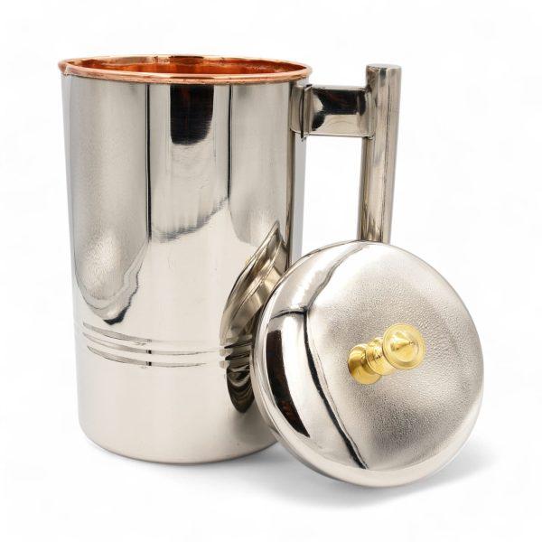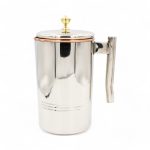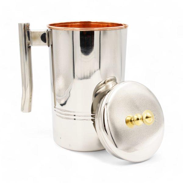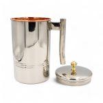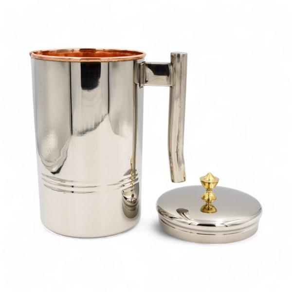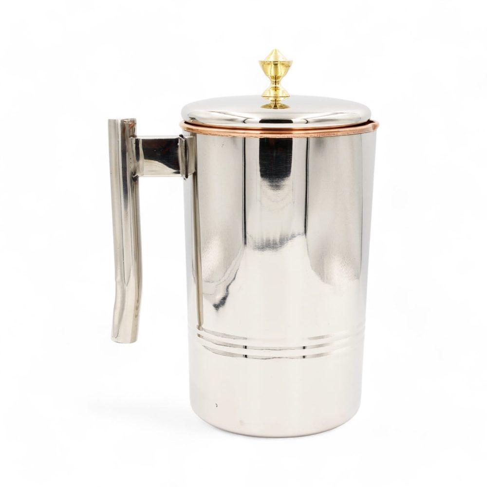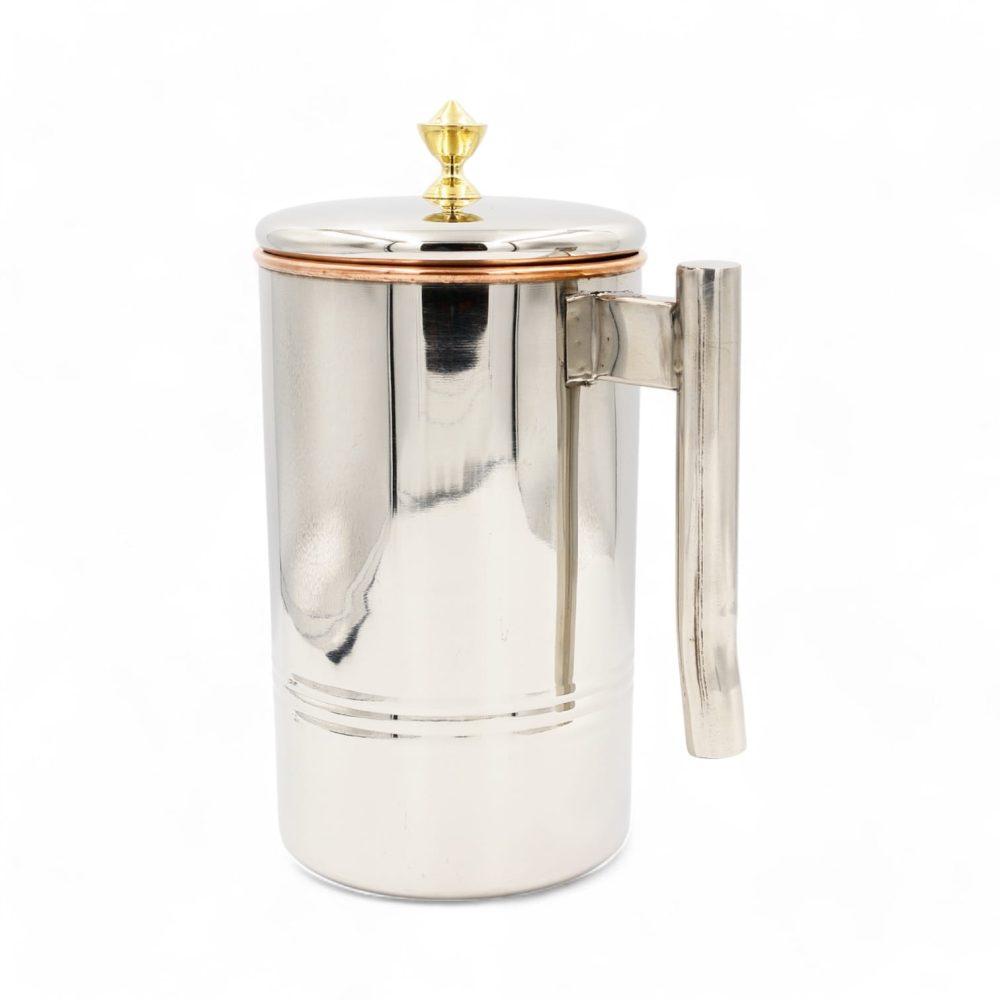 Vollständige Beschreibung: Dieser moderne Krug vereint traditionelle ayurvedische Weisheit mit zeitgemäßem Design. Während das Wasser im Inneren direkt mit reinem Kupfer in Kontakt kommt, um auf klassische Weise veredelt zu werden (Tamra Jal), sorgt das äußere Edelstahl-Finish für eine elegante Optik. Diese Kombination ist besonders pflegeleicht und langlebig – ideal für alle, die die Vorteile von Kupferwasser nutzen möchten, aber ein modernes Küchendesign bevorzugen.