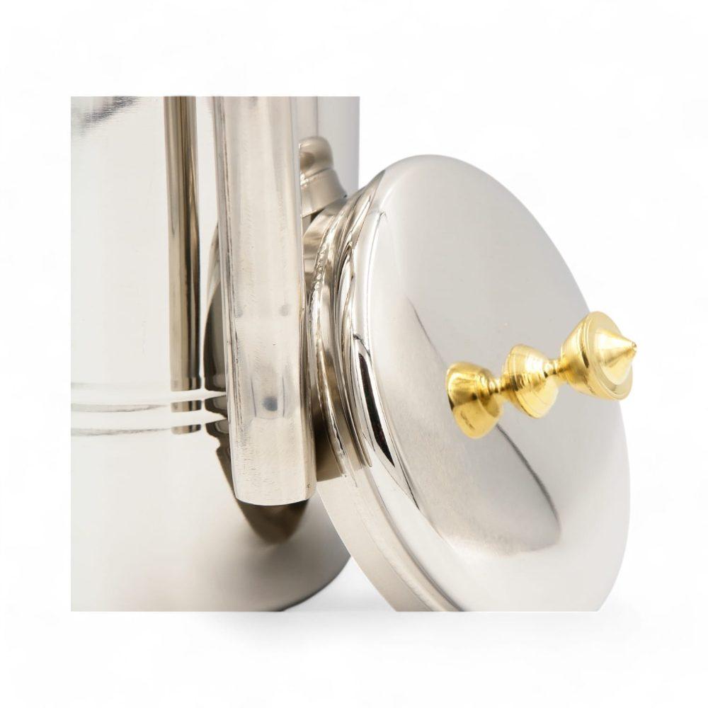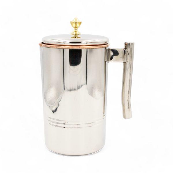 Kurzbeschreibung: Hochwertige Kupferkanne (ca. 1900 ml) in moderner Optik durch edles Edelstahl-Finish. Die perfekte Kombination aus den traditionellen Eigenschaften von Kupfer im Inneren und einer robusten, glänzenden Edelstahlschicht im Außenbereich.