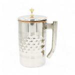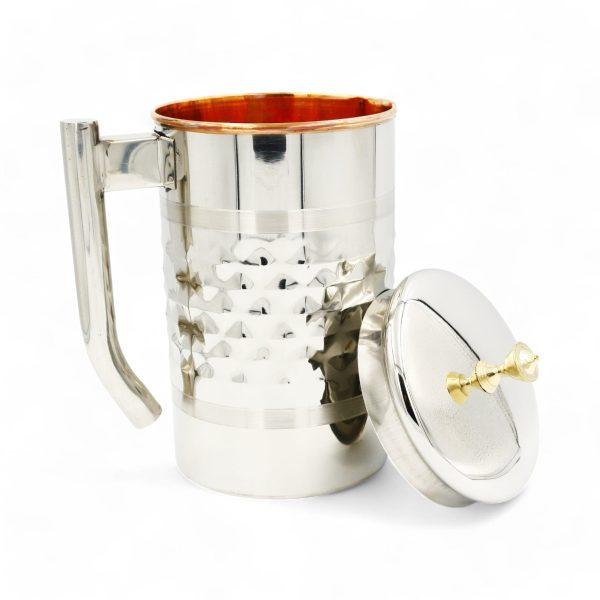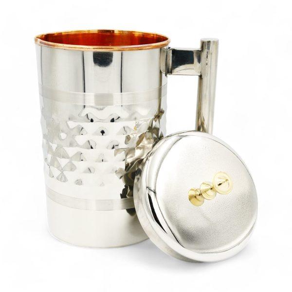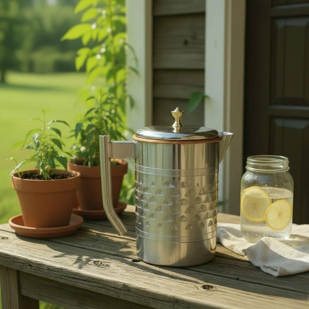 Vollständige Beschreibung: Dieser handgefertigte Krug besticht durch sein markantes Diamant-Muster, das für faszinierende Lichtreflexe auf der Edelstahloberfläche sorgt. Während das Wasser im Inneren direkt mit reinem Kupfer in Kontakt kommt, um auf traditionelle Weise veredelt zu werden (Tamra Jal), schützt die äußere Edelstahlschicht die Kanne vor natürlicher Patina und macht sie besonders pflegeleicht. Ein perfektes Accessoire für moderne Küchen und einen gesundheitsbewussten Lebensstil.