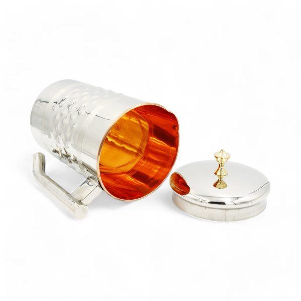 Pflegehinweis: Dank der äußeren Edelstahlschicht bleibt der silberne Glanz dauerhaft erhalten. Die Innenseite aus Kupfer sollte regelmäßig mit einer Mischung aus Zitrone und Salz gereinigt werden, um die natürlichen Eigenschaften des Metalls zu bewahren.
