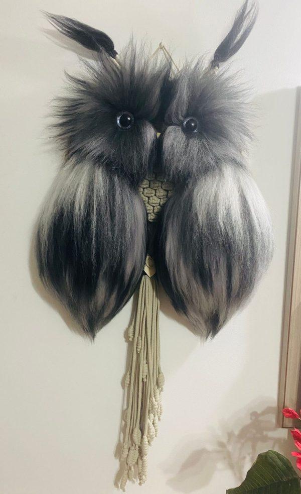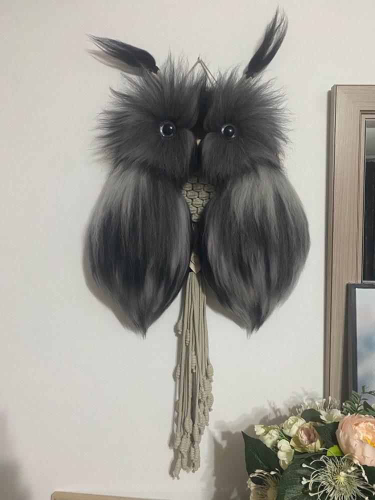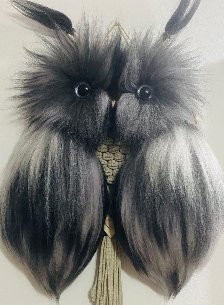 Diese außergewöhnliche Makramee-Eule ist ein stilvolles Dekorationselement, das in aufwendiger Handarbeit gefertigt wurde.