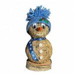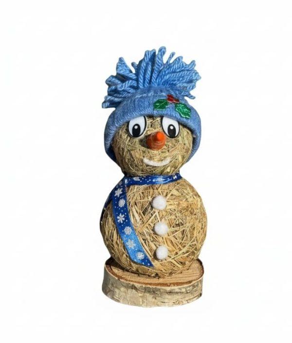 - Schneemann mit blauer Mütze: Gekleidet in einen Schal mit blau-weißen Sternen und weißen Knöpfen.
