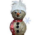 - Material: Natürliches Heu, Wolle, Plastikaugen, Band, Garn und eine Plastiknase. Die Schneemänner stehen auf stabilen Untersetzern aus Naturholz.