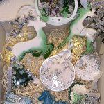- Drei volle Weihnachtskugeln: Runde Kugeln, verziert mit glitzerndem Glitzer und zarten Mustern, die der Dekoration Eleganz verleihen.